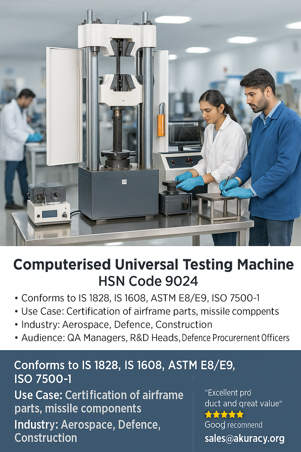 Akuracy isnβt just a manufacturerβweβre a partner in your growth. Our OEM testing machines and NABL-certified calibration ensure accurate results every time. With a DSIR-approved R&D investment of βΉ1.5 Cr, we create innovative, affordable, and economical solutions that industries trust. From defence to aerospace and PSUs, our customers value our service, reliability, and excellence. Join the growing network of satisfied customers. Book your free video demo today and experience our customer-first approach.